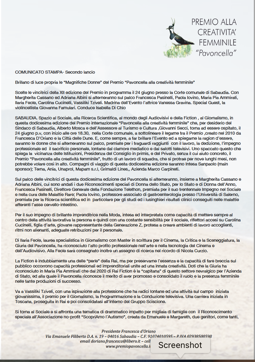 Comunicati Stampa: Premio Pavoncella XII Edizione ( 24 giugno 2023) di premiopavoncella19 Giugno 202321 Febbraio 2024Comunicati Stampa Premio, News SECONDO LANCIO 1/2 Immagine 3 di 4