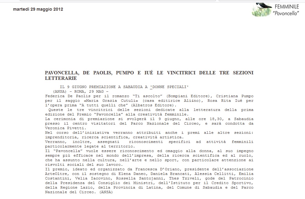 Comunicati Stampa: Premio Pavoncella I Edizione (9 giugno 2012) Ansa: 29 Maggio 2012 Immagine 6 di 6 Share Me On: