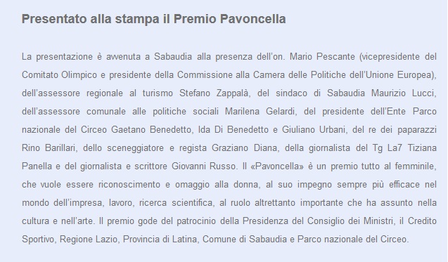 Comunicati Stampa: Premio Pavoncella I Edizione (9 giugno 2012) Ufficio Stampa: A cura di Romano Tripodi Immagine 2 di 6 Share Me On: