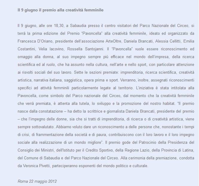 Comunicati Stampa: Premio Pavoncella I Edizione (9 giugno 2012) Ufficio Stampa (A Cura di Romano Tripodi): 22 Maggio 2012 Immagine 3 di 6 Share Me On: