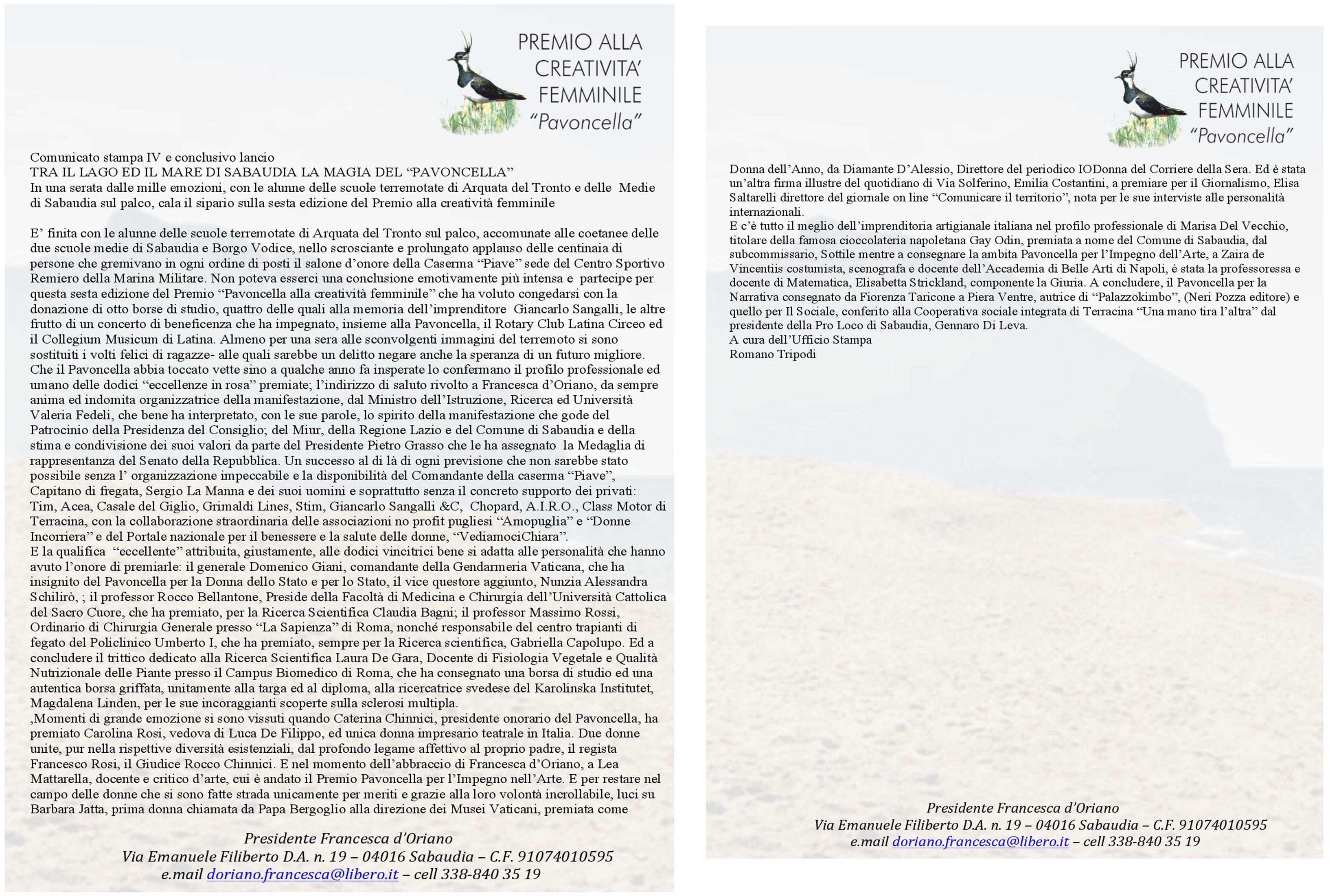 Comunicati Stampa: Premio Pavoncella VI Edizione ( 17 giugno 2017) Comunicato Stampa A Cura di Romani Tripodi: Pubblicato da "Anima Per il Sociale Immagine 1 di 2 Share Me On: