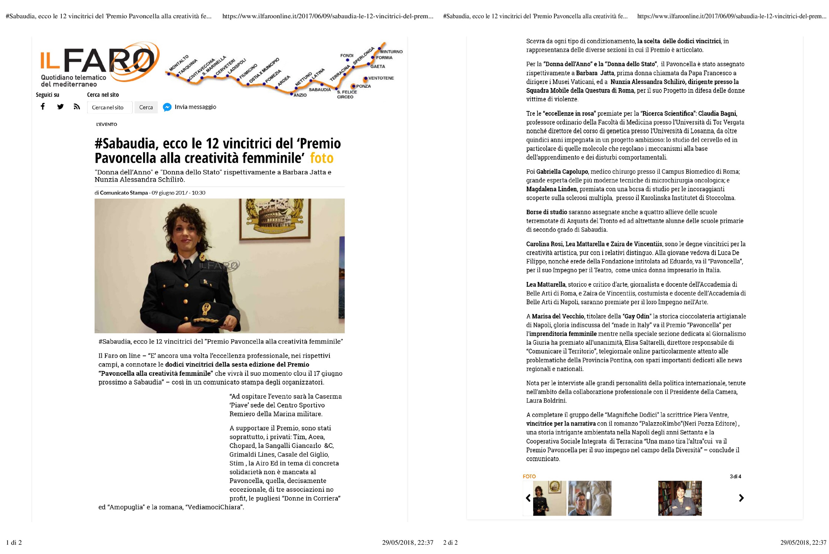 Comunicati Stampa: Premio Pavoncella VI Edizione ( 17 giugno 2017) Il Faro: 9 Giugno 2017 Immagine 2 di 2 Share Me On:
