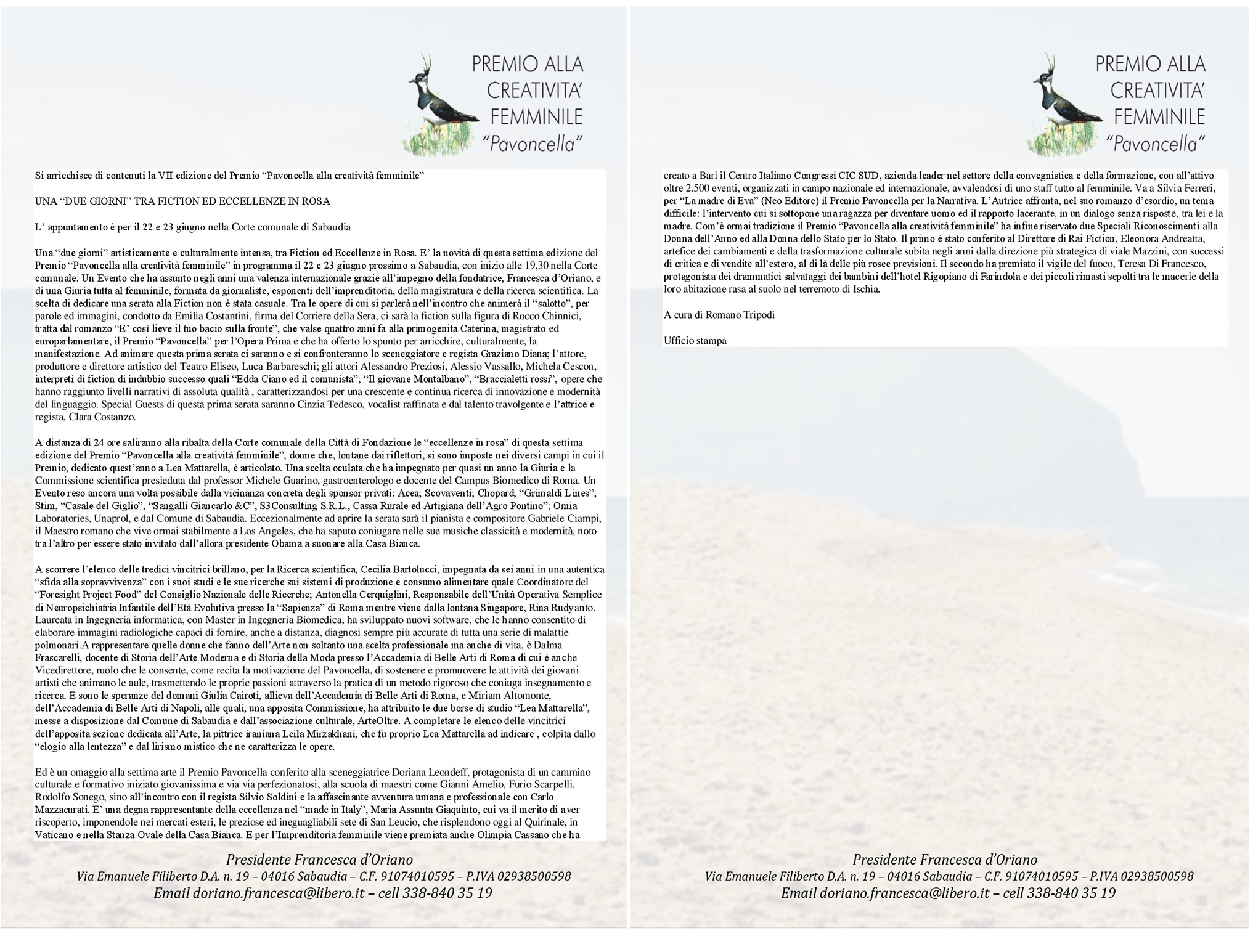 Comunicati Stampa: Premio Pavoncella VII Edizione (22-23 giugno 2018) Terzo Comunicato Stampa: A Cura di Romano Tripodi Immagine 3 di 3 Share Me On: