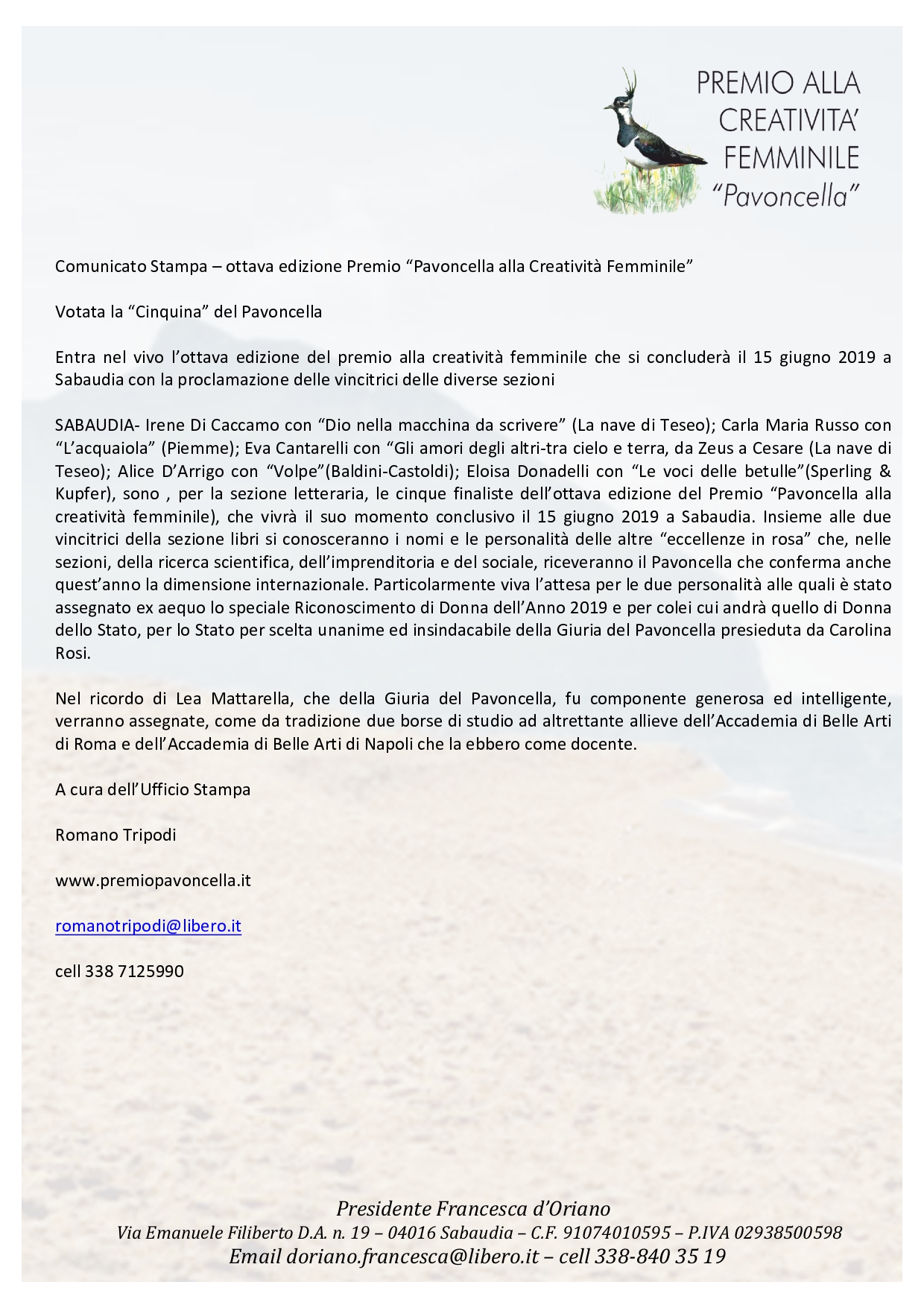 Comunicati Stampa: Premio Pavoncella VIII Edizione (15 giugno 2019) Primo Comunicato Stampa Immagine 3 di 3 Share Me On: