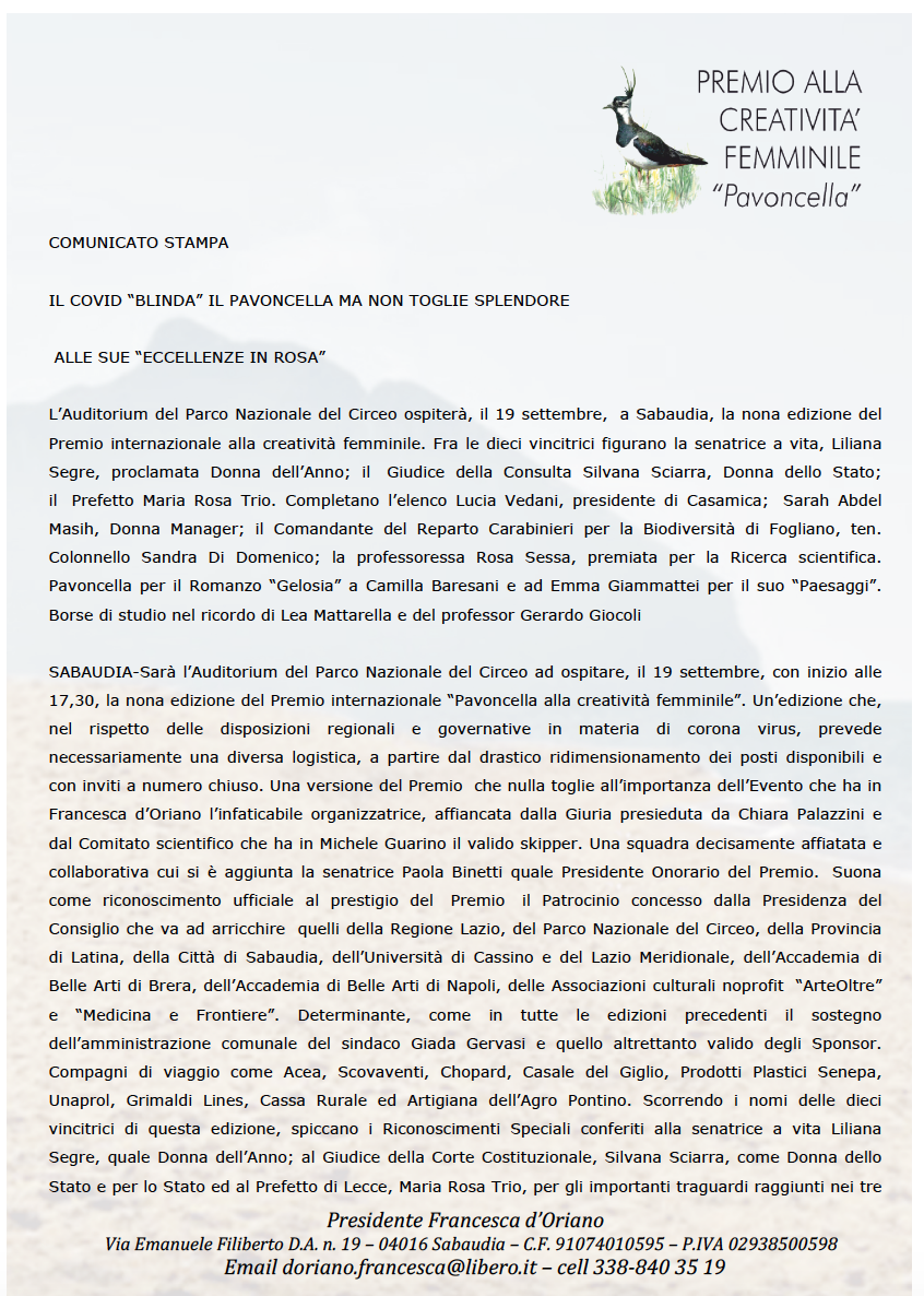 Comunicati Stampa: Premio Pavoncella IX Edizione ( 19 settembre 2020) Comunicato Stampa : SecondoLancio 1/3 Immagine 2 di 5 Share Me On: