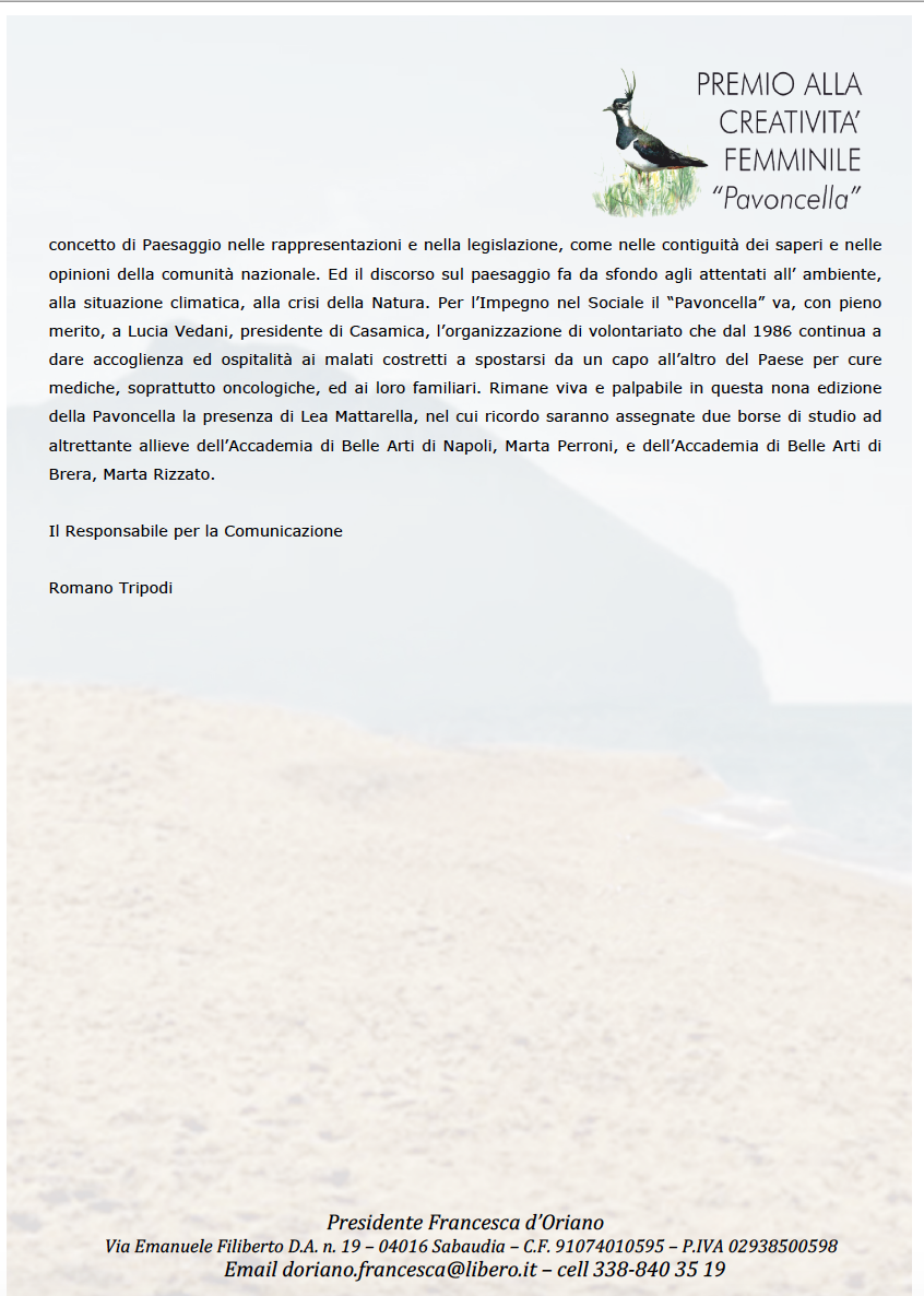 Comunicati Stampa: Premio Pavoncella IX Edizione ( 19 settembre 2020) Comunicato Stampa : SecondoLancio 3/3 Immagine 4 di 5 Share Me On: