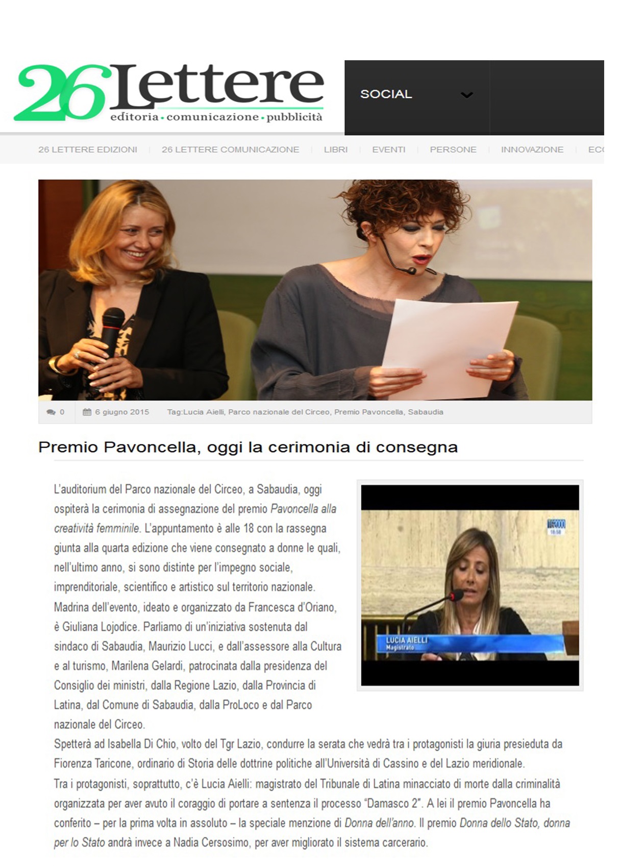 Rassegna Stampa: Premio Pavoncella IV Edizione ( 6 giugno 2015) 26Lettere.it: 6 Giugno 2015 Immagine 4 di 25 Share Me On: