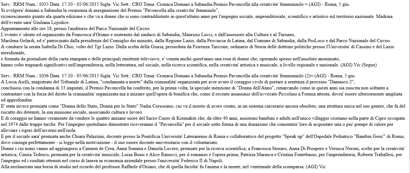 Rassegna Stampa: Premio Pavoncella IV Edizione ( 6 giugno 2015) Agi: 5 Giugno 2015 Immagine 15 di 25 Share Me On: