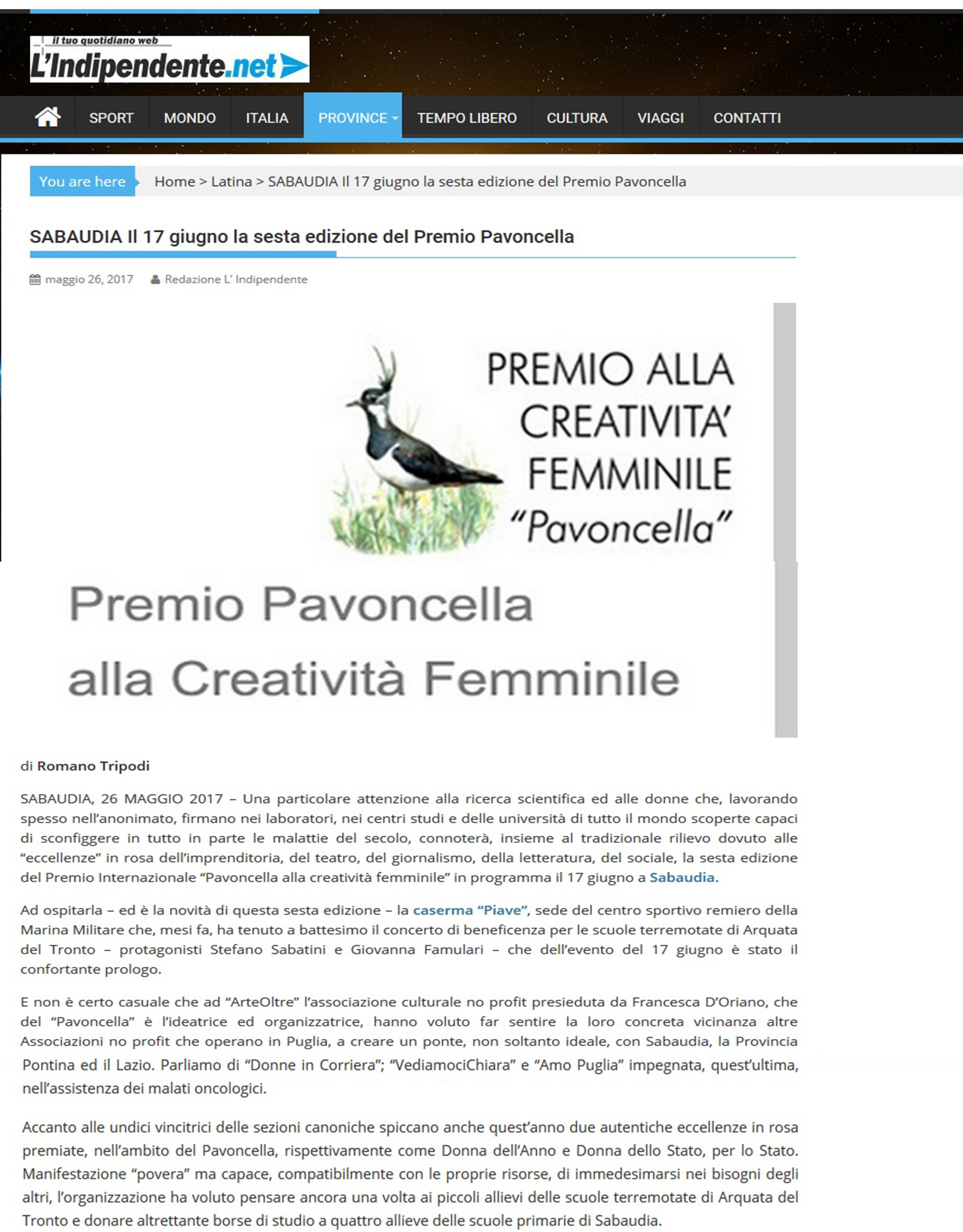 Rassegna Stampa: Premio Pavoncella VI Edizione (17 giugno 2017) L'Indipendente: 26 Maggio 2017 Immagine 2 di 21 Share Me On: