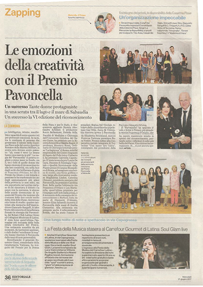 Rassegna Stampa: Premio Pavoncella VI Edizione (17 giugno 2017) Latina Editoriale Oggi: 21 Giugno 2017 Immagine 16 di 21 Share Me On: