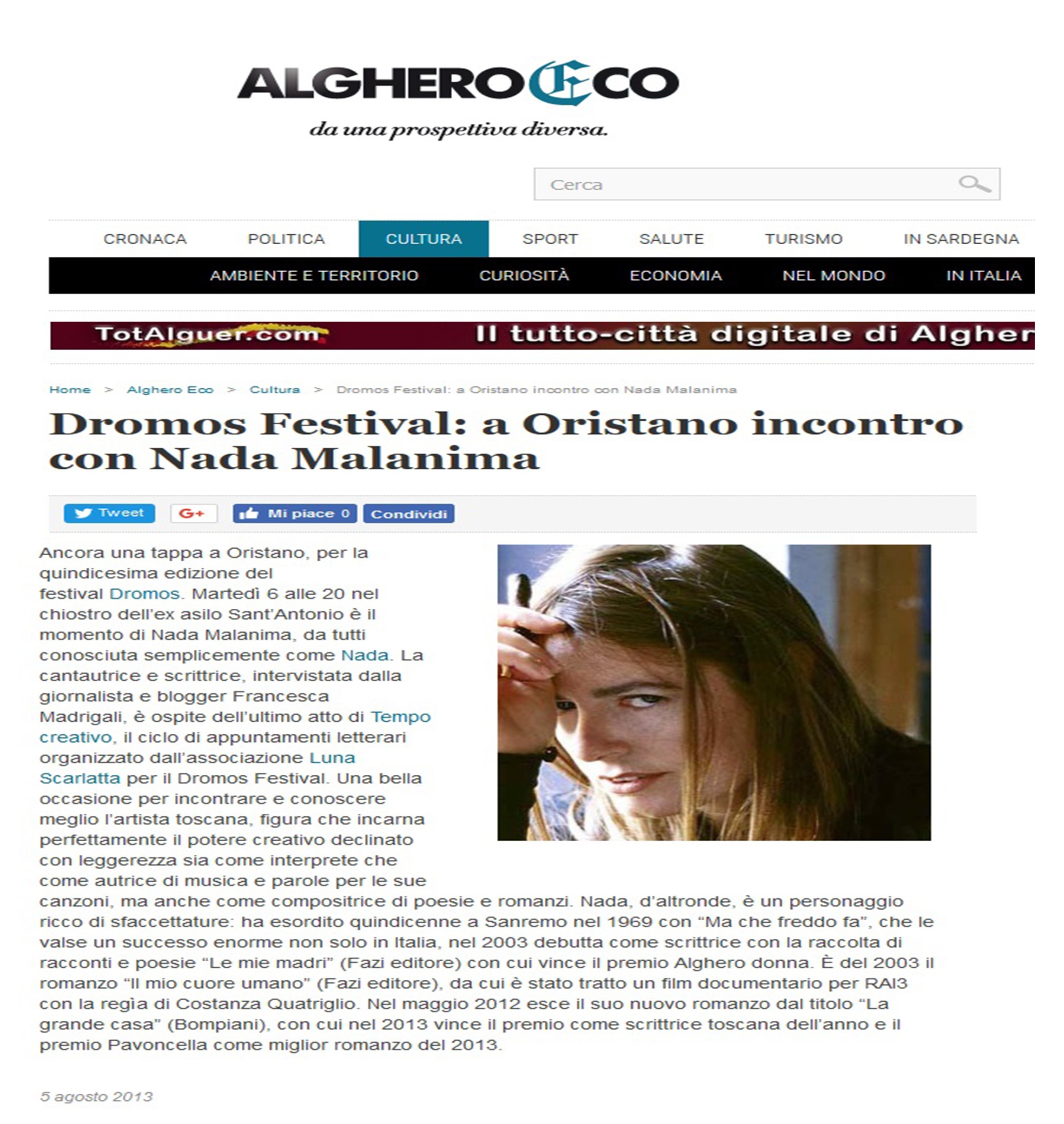 Rassegna Stampa: Premio Pavoncella II Edizione (15 giugno 2013) Alghero Eco: 5 Agosto 2013 Immagine 20 di 23 Share Me On: