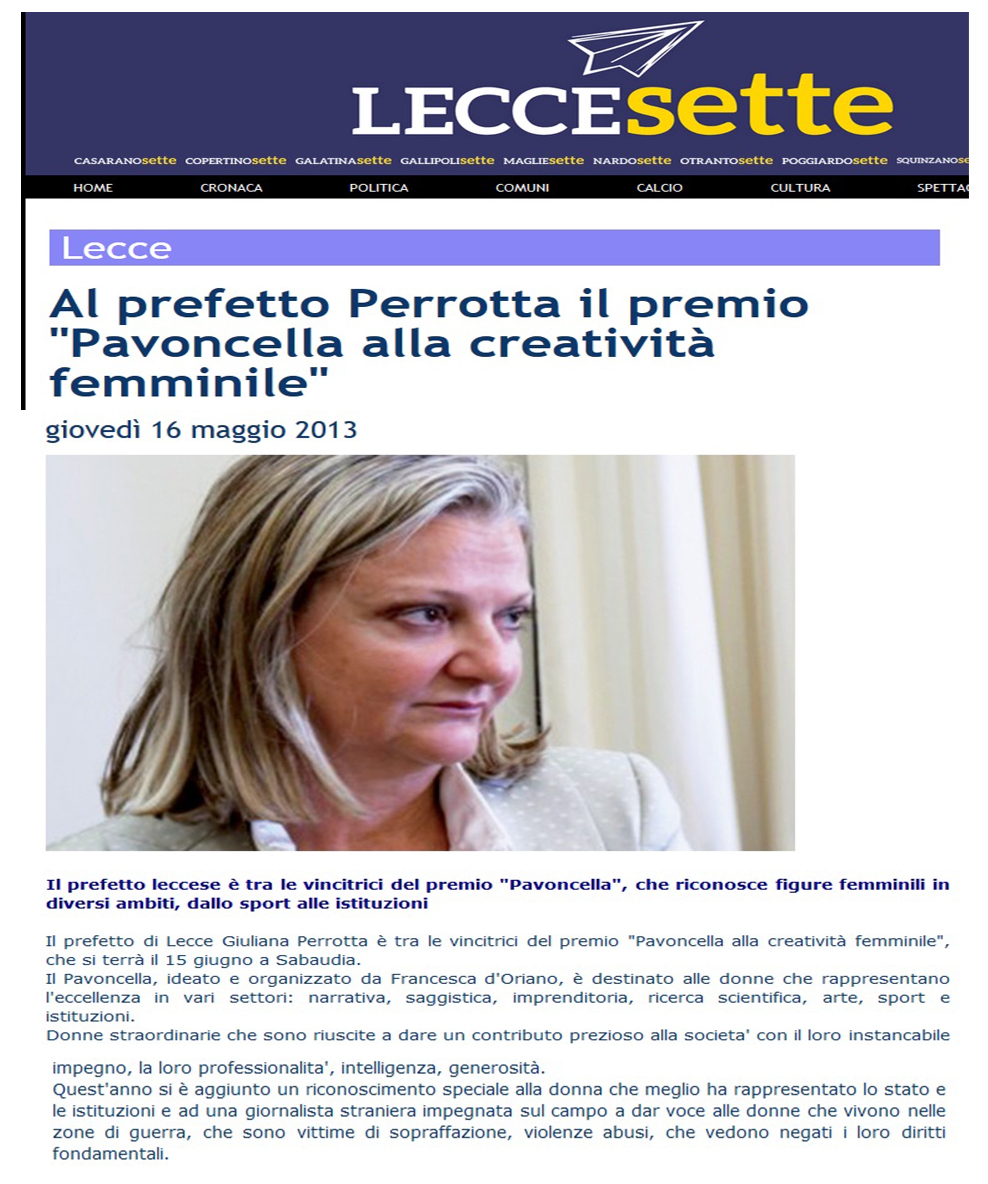 Rassegna Stampa: Premio Pavoncella II Edizione (15 giugno 2013) LecceSette: 16 Maggio 2013 Immagine 5 di 23 Share Me On: