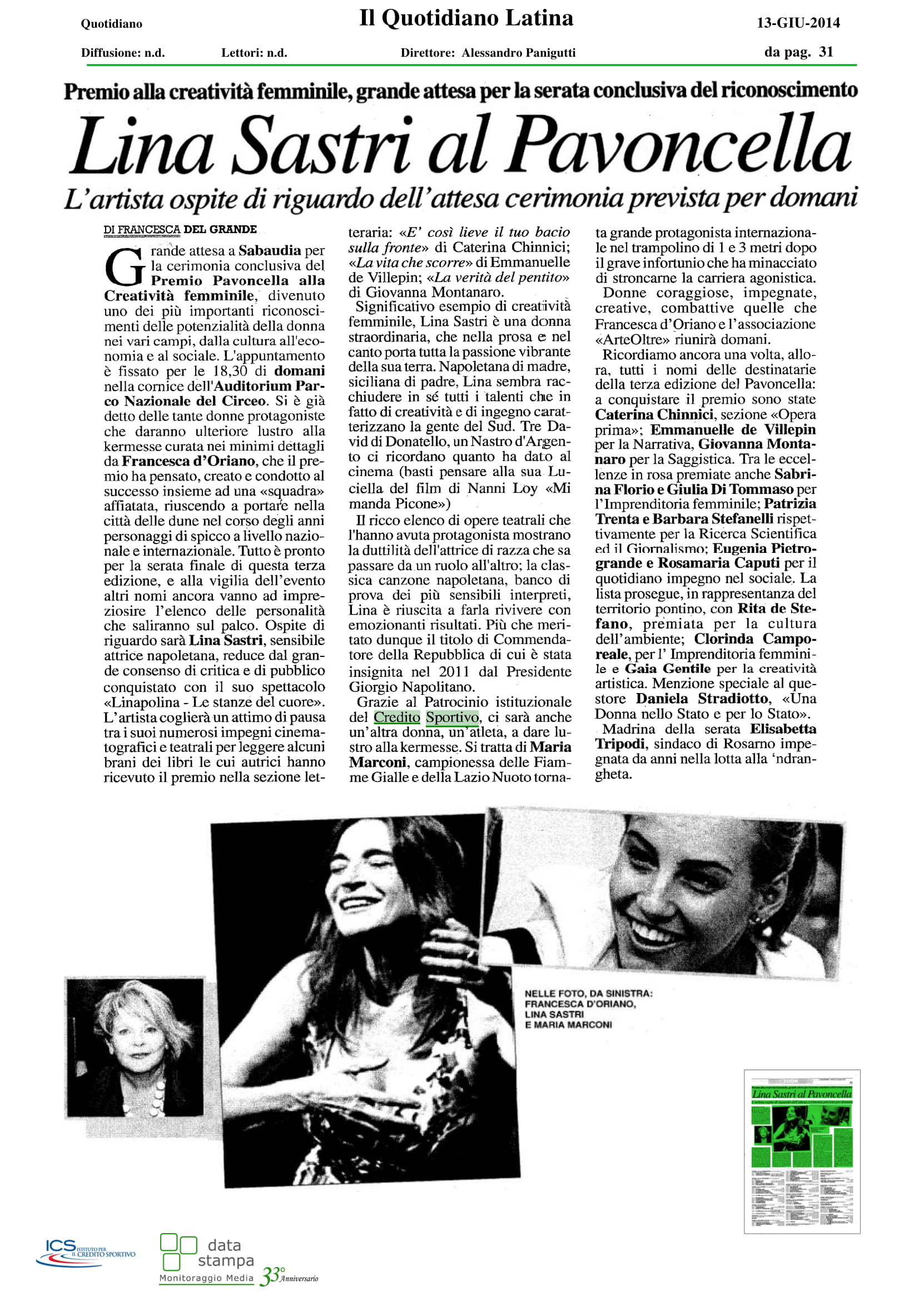 Rassegna Stampa: Premio Pavoncella III Edizione ( 14 giugno 2014) Il Quotidiano di Latina: 13 Giugno 2014 Immagine 23 di 25 Share Me On: