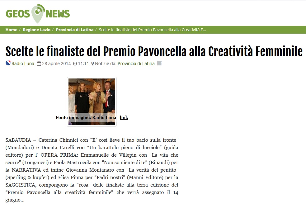 Rassegna Stampa: Premio Pavoncella III Edizione ( 14 giugno 2014) Geos News: 28 Aprile 2014 Immagine 3 di 25 Share Me On: