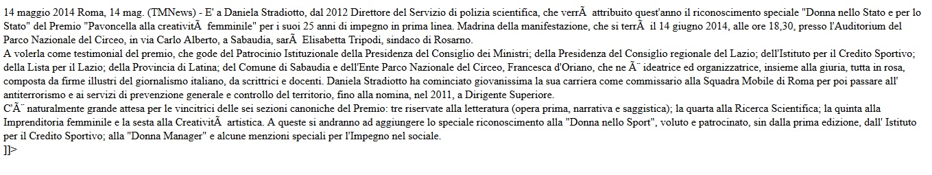 Rassegna Stampa: Premio Pavoncella III Edizione ( 14 giugno 2014) Notizie Tiscali: 14 Maggio 2014 Immagine 5 di 25 Share Me On: