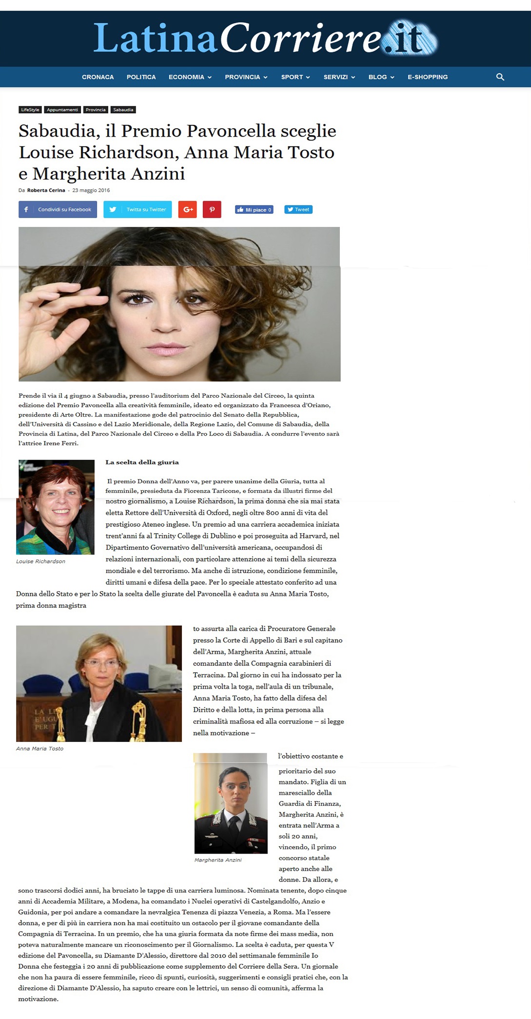 Rassegna Stampa: Premio Pavoncella V Edizione (4 giugno 2016) Latina Corriere.it: 23 Maggio 2016 Immagine 13 di 32 Share Me On: