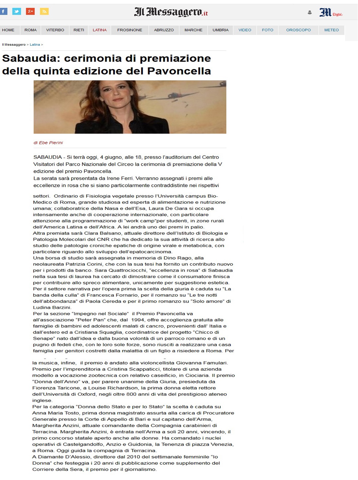 Rassegna Stampa: Premio Pavoncella V Edizione (4 giugno 2016) Il Messaggero: 4 Giugno 2016 Immagine 21 di 32 Share Me On: