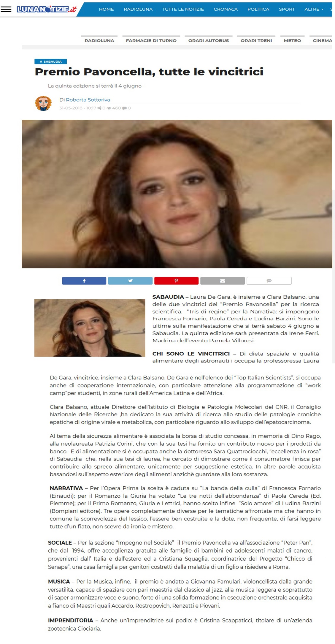 Rassegna Stampa: Premio Pavoncella V Edizione (4 giugno 2016) Radio Luna: 4 Giugno 2016 Immagine 22 di 32 Share Me On: