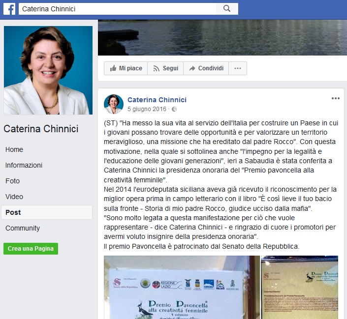 Rassegna Stampa: Premio Pavoncella V Edizione (4 giugno 2016) Caterina Chinnici Facebook: 5 Giugno 2016 Immagine 23 di 32 Share Me On: