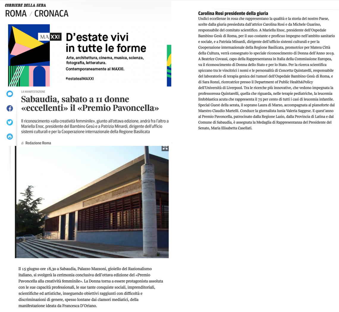 Rassegna Stampa: Premio Pavoncella VIII Edizione (15 giugno 2019) Corriere della Sera 13 Giugno 2019 Immagine 7 di 45 Share Me On: