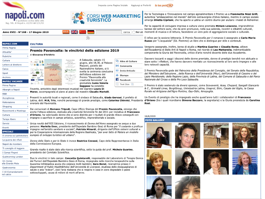 Rassegna Stampa: Premio Pavoncella VIII Edizione (15 giugno 2019) Napoli.com 16 giugno 2019 Immagine 9 di 45 Share Me On: