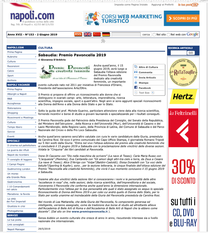 Rassegna Stampa: Premio Pavoncella VIII Edizione (15 giugno 2019) Napoli.com 29 Maggio 2019 Immagine 31 di 45 Share Me On: