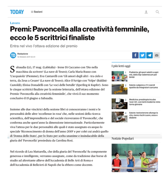 Rassegna Stampa: Premio Pavoncella VIII Edizione (15 giugno 2019) Today.it 18 Maggio 2019 Immagine 27 di 45 Share Me On: