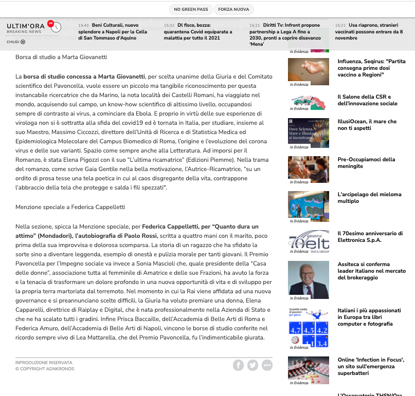 Rassegna Stampa: Premio Pavoncella X Edizione (4 settembre 2021) Adnkronos 3/3 Immagine 7 di 52 Share Me On: