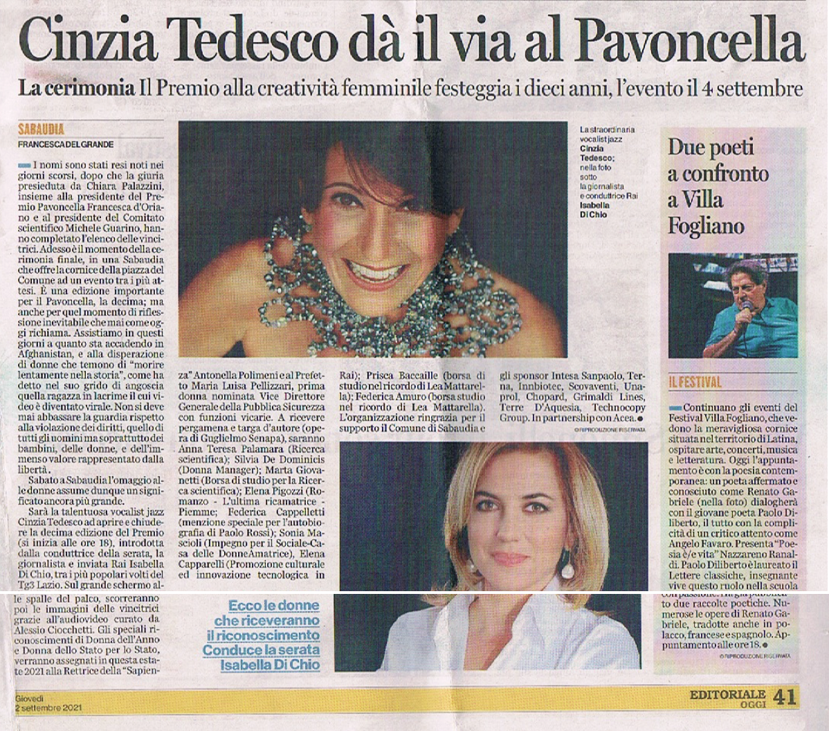 Rassegna Stampa: Premio Pavoncella X Edizione (4 settembre 2021) Editoriale Oggi 2 settembre 2021 Immagine 2 di 52 Share Me On: