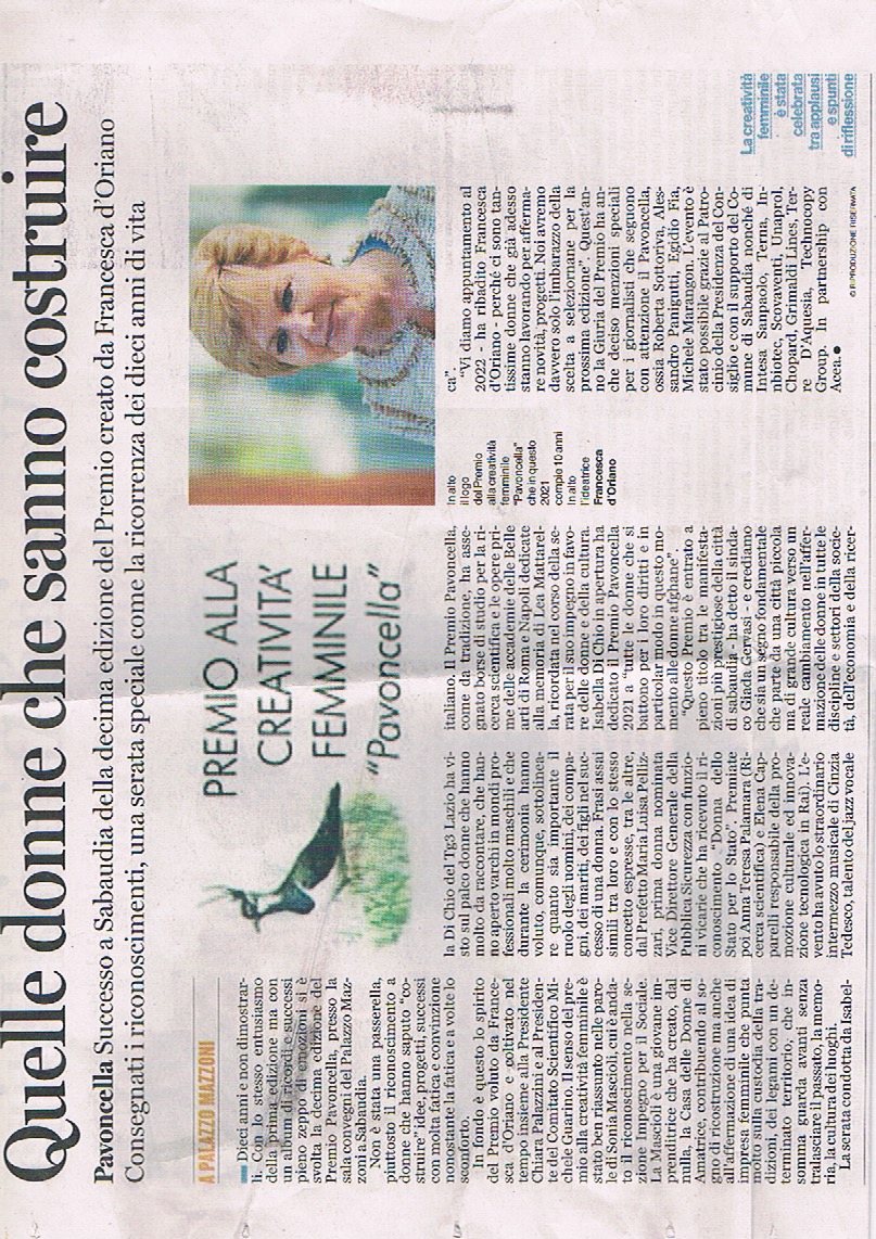 Rassegna Stampa: Premio Pavoncella X Edizione (4 settembre 2021) Editoriale Oggi 8 settembre 2021 Immagine 3 di 52 Share Me On: