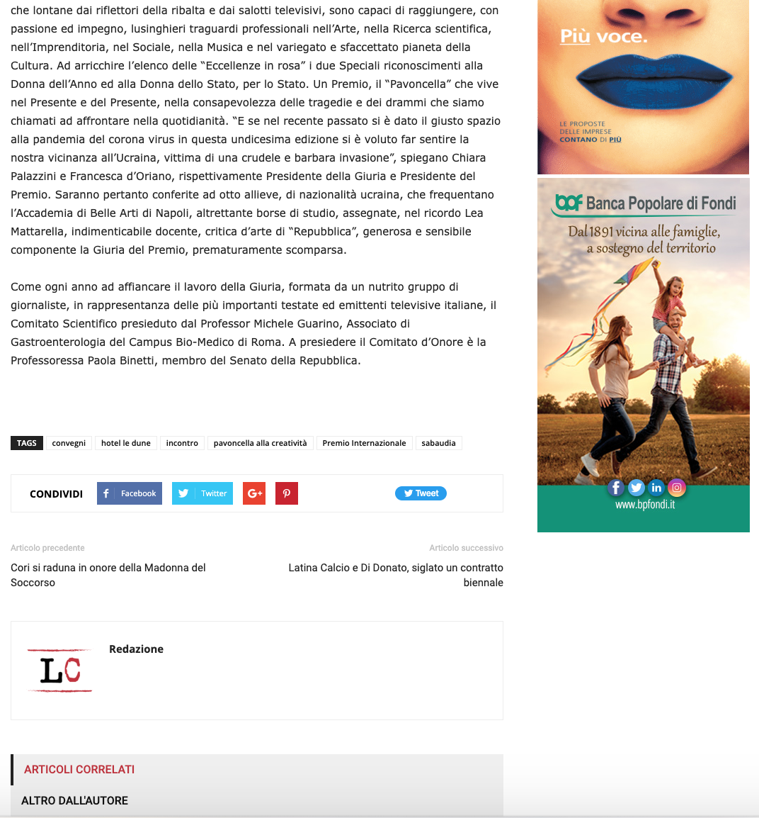 Rassegna Stampa: Premio Pavoncella XI Edizione (18 giugno 2022) Latina Corriere 2/2 Immagine 5 di 11 Share Me On: