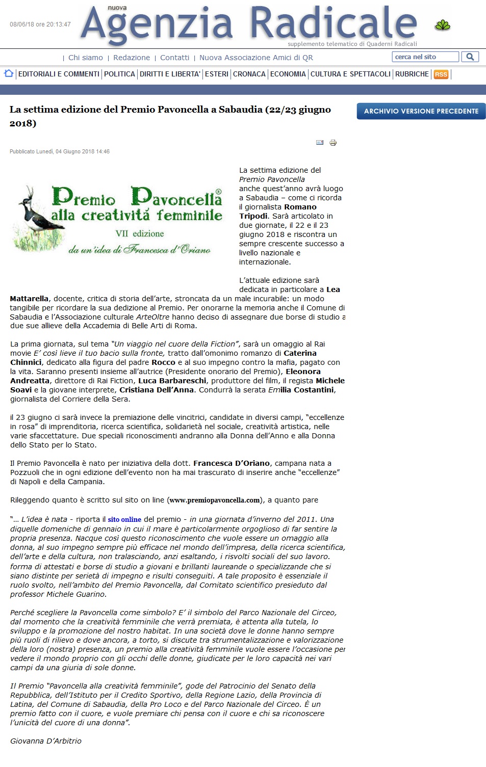 RassegnaStampa: Premio Pavoncella VII Edizione (22-23 giugno 2018) Agenzia Radicale: 4 Giugno 2018 Immagine 4 di 19 Share Me On: