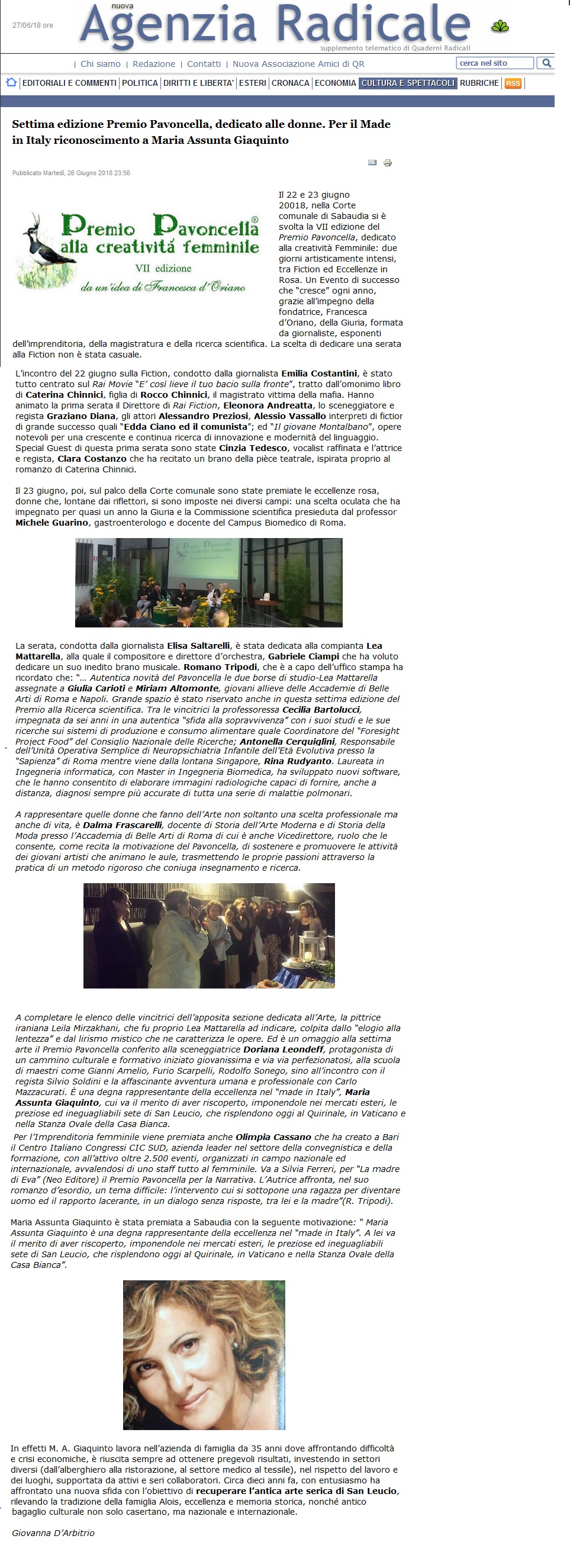 RassegnaStampa: Premio Pavoncella VII Edizione (22-23 giugno 2018) Agenzia Radicale: 27 Giugno 2018 Immagine 15 di 19 Share Me On: