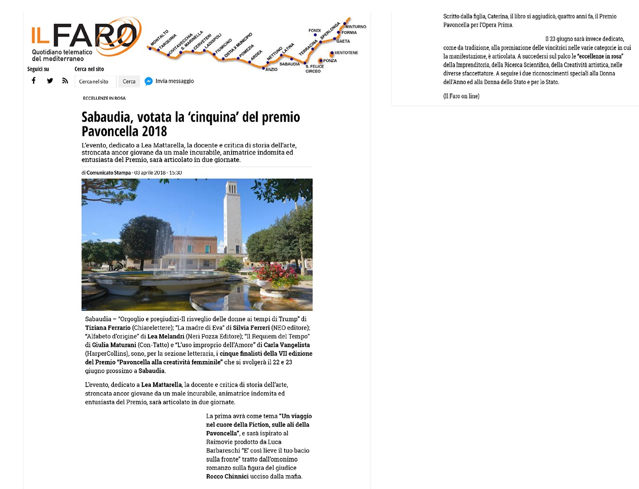 RassegnaStampa: Premio Pavoncella VII Edizione (22-23 giugno 2018) Il Faro: 3 Aprile 2018 Immagine 2 di 19 Share Me On: