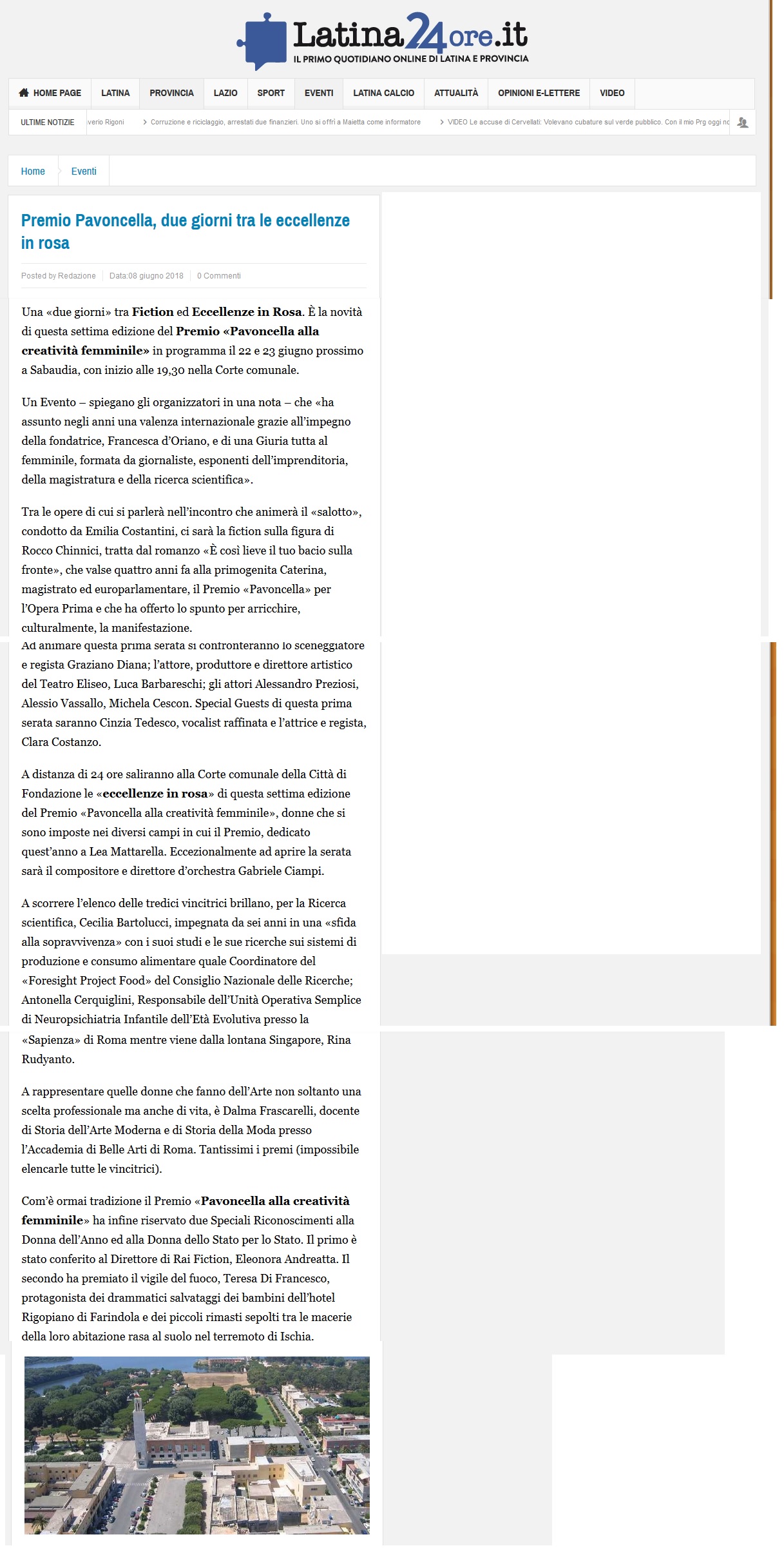 RassegnaStampa: Premio Pavoncella VII Edizione (22-23 giugno 2018) Latina24Ore: 8 Giugno 2018 Immagine 5 di 19 Share Me On: